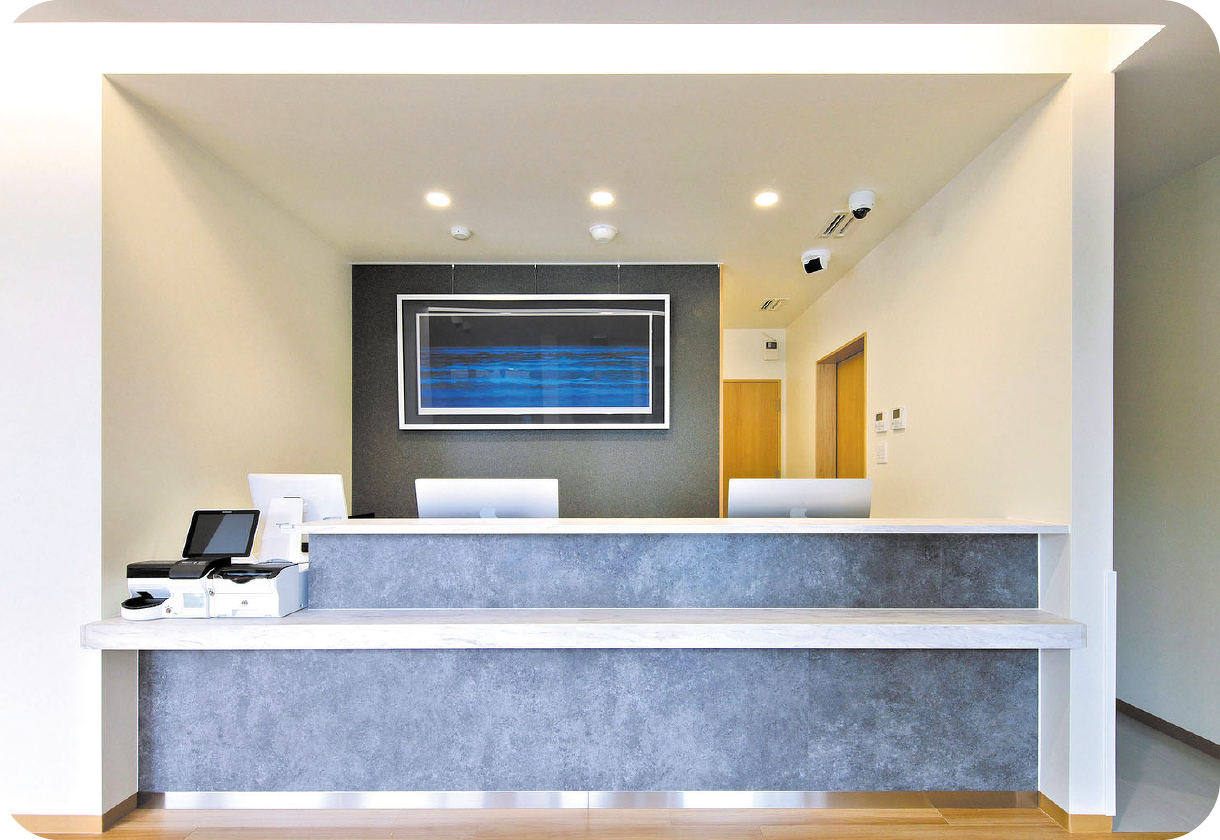 また、中に入ってからはすぐに受付があり、医科診療と歯科診療へわかりやすく誘導し、2階へのリハビリルームへもエレベータを装備し、利用者の皆さんのご負担にならないように使い勝手にも配慮しています。